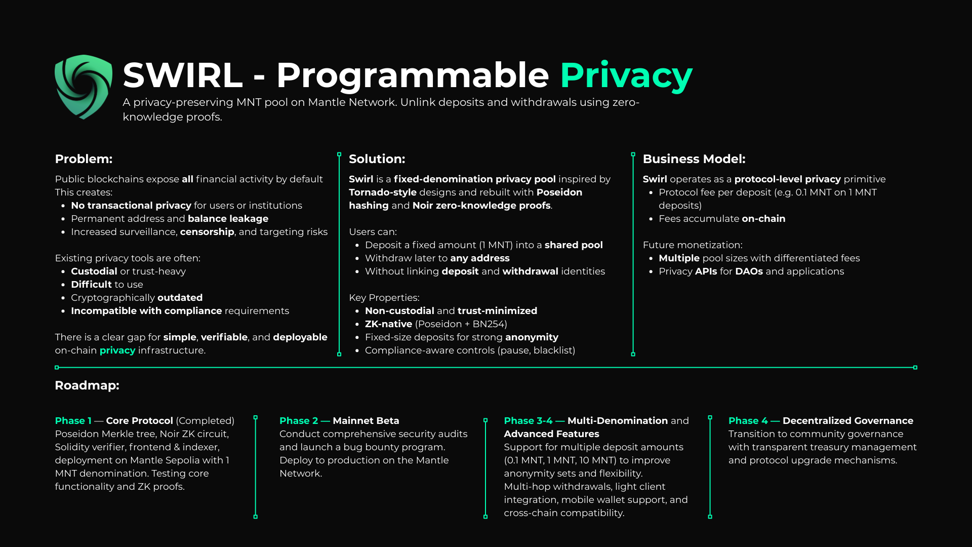 Swirl is a privacy-preserving protocol that enables users to transfer funds anonymously through the use of zero-knowledge proofs.