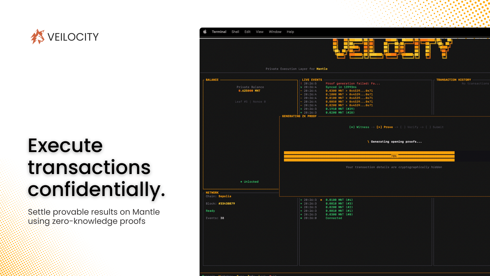 During this hackathon, we built Veilocity from concept to fully functional prototype with 78+ passing tests across all components. We implemented the complete cryptographic stack: three Noir circuits (deposit ~500 constraints, withdrawal ~8,000 constraints, transfer ~15,000 constraints) with Poseidon hashing and Merkle tree verification at depth 20 supporting 1 million accounts. On the smart contract side, we deployed VeilocityVault.sol to Mantle Sepolia with full deposit/withdraw functionality, nullifier tracking for double-spend prevention, state root history management, pausability, and emergency withdrawal mechanisms - backed by 29 comprehensive Foundry tests. The Rust implementation spans four crates totaling thousands of lines of production-quality code: veilocity-core for state management and cryptographic primitives, veilocity-prover for witness generation and Noir/Barretenberg integration, veilocity-contracts for ABI bindings and real-time event indexing, and veilocity-cli providing a full-featured command-line interface with wallet encryption (AES-256-GCM + Argon2id), deposit/transfer/withdraw commands, state synchronization, and transaction history. We also built a Next.js 15 web demo with Privy authentication demonstrating the user experience, and an indexer service with REST API for real-time state queries. The entire stack was integrated end-to-end: we successfully executed deposits on Mantle Sepolia, synchronized state locally, generated ZK proofs, and verified them against the deployed contract. This represents a complete vertical slice of privacy infrastructure - from cryptographic circuits to user interface - built entirely during the hackathon period.
