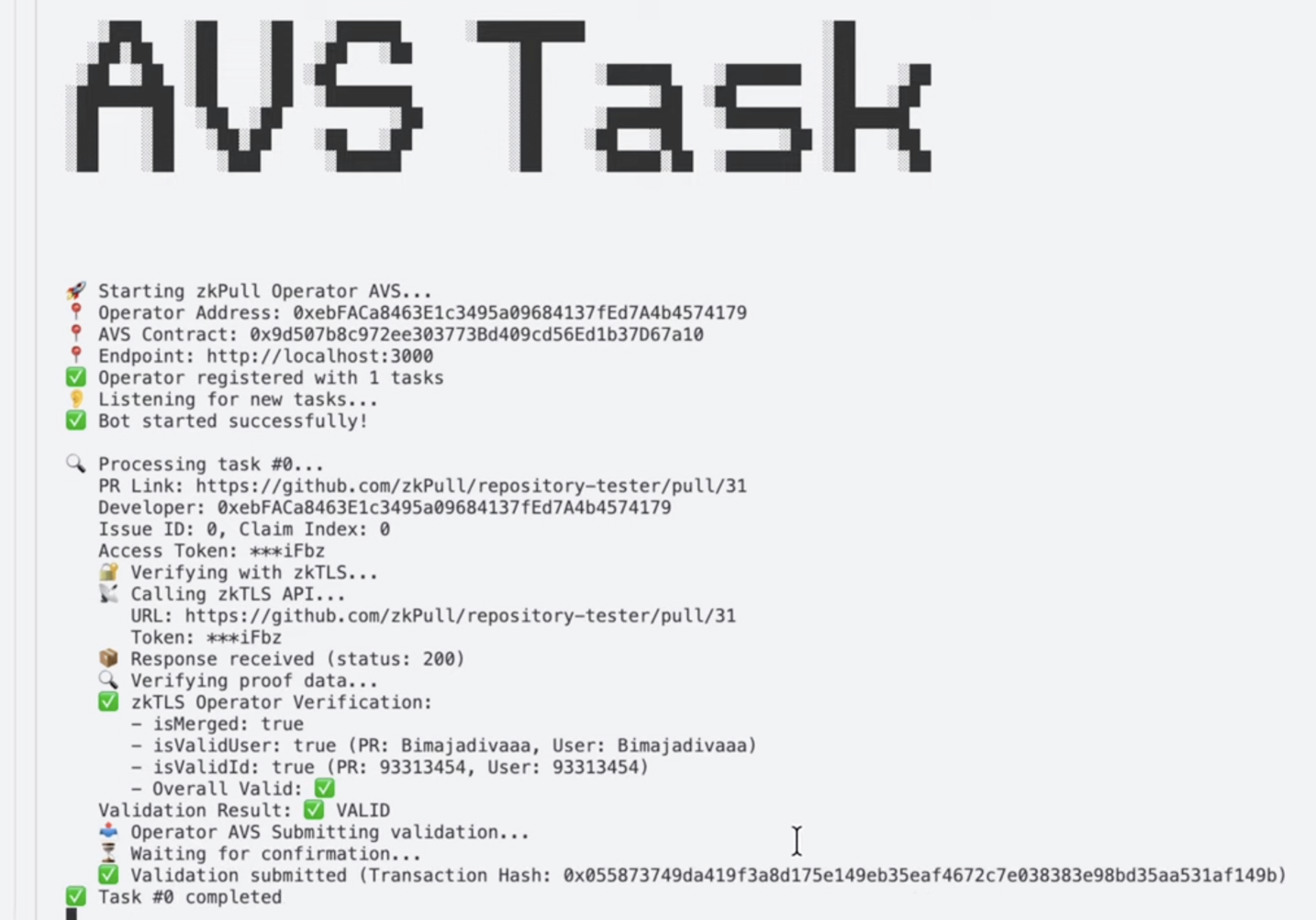 zkTLS generates a zero-knowledge proof that verifies the PR status and contributor identity without exposing sensitive data.