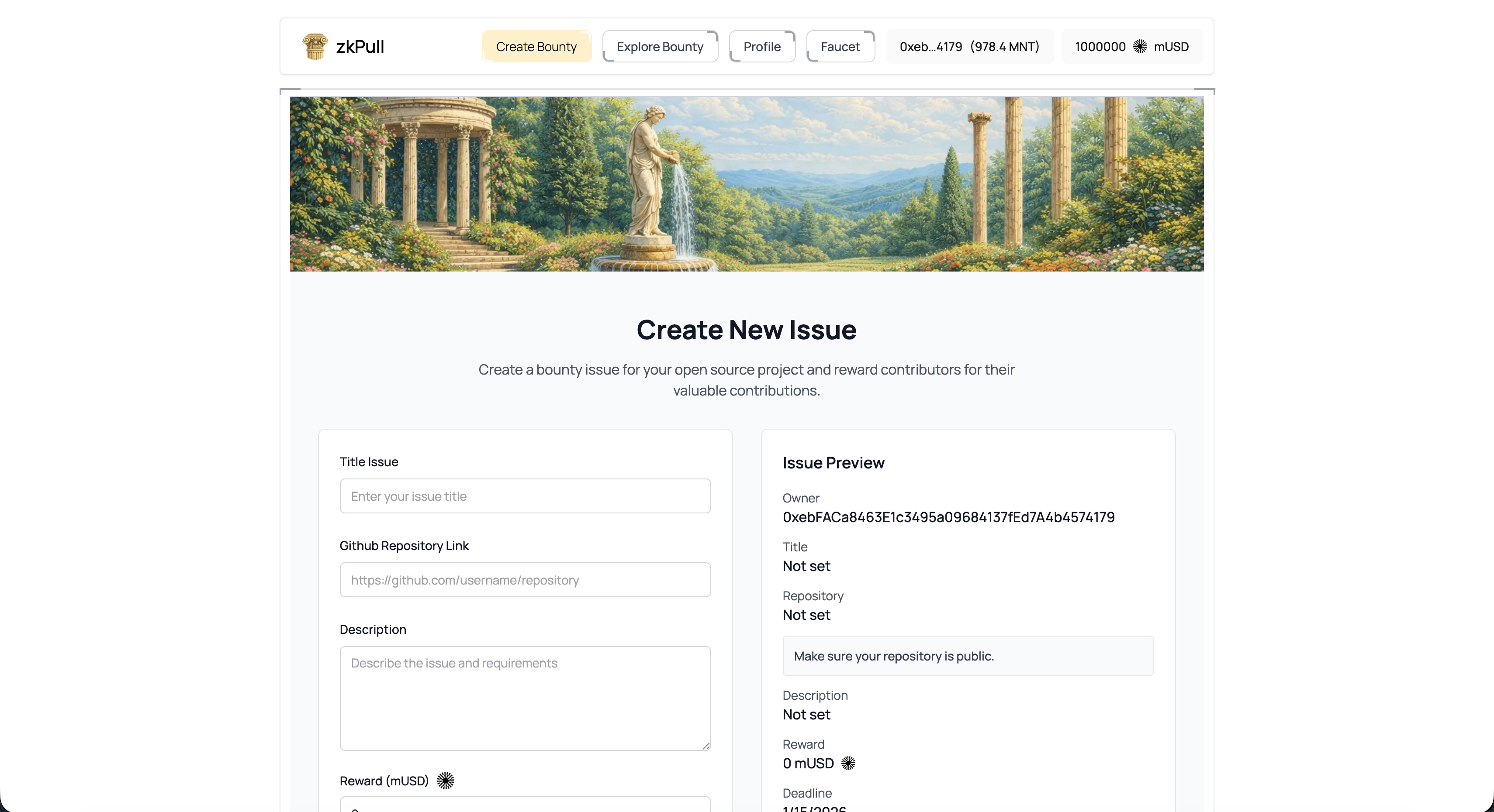 zkPull allows project owners to create bounties directly linked to GitHub issues, with rewards locked on-chain from the start.