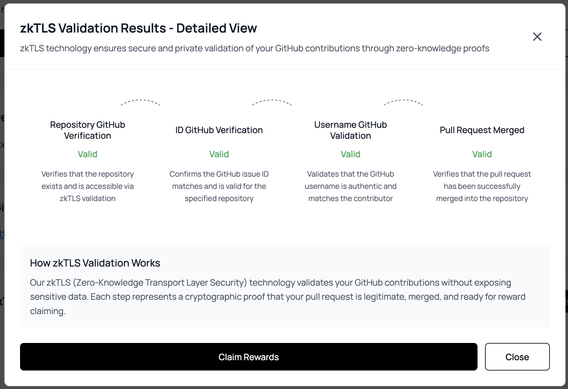 zkPull uses zkTLS (Zero-Knowledge Transport Layer Security) to verify off-chain GitHub data in a privacy-preserving way.